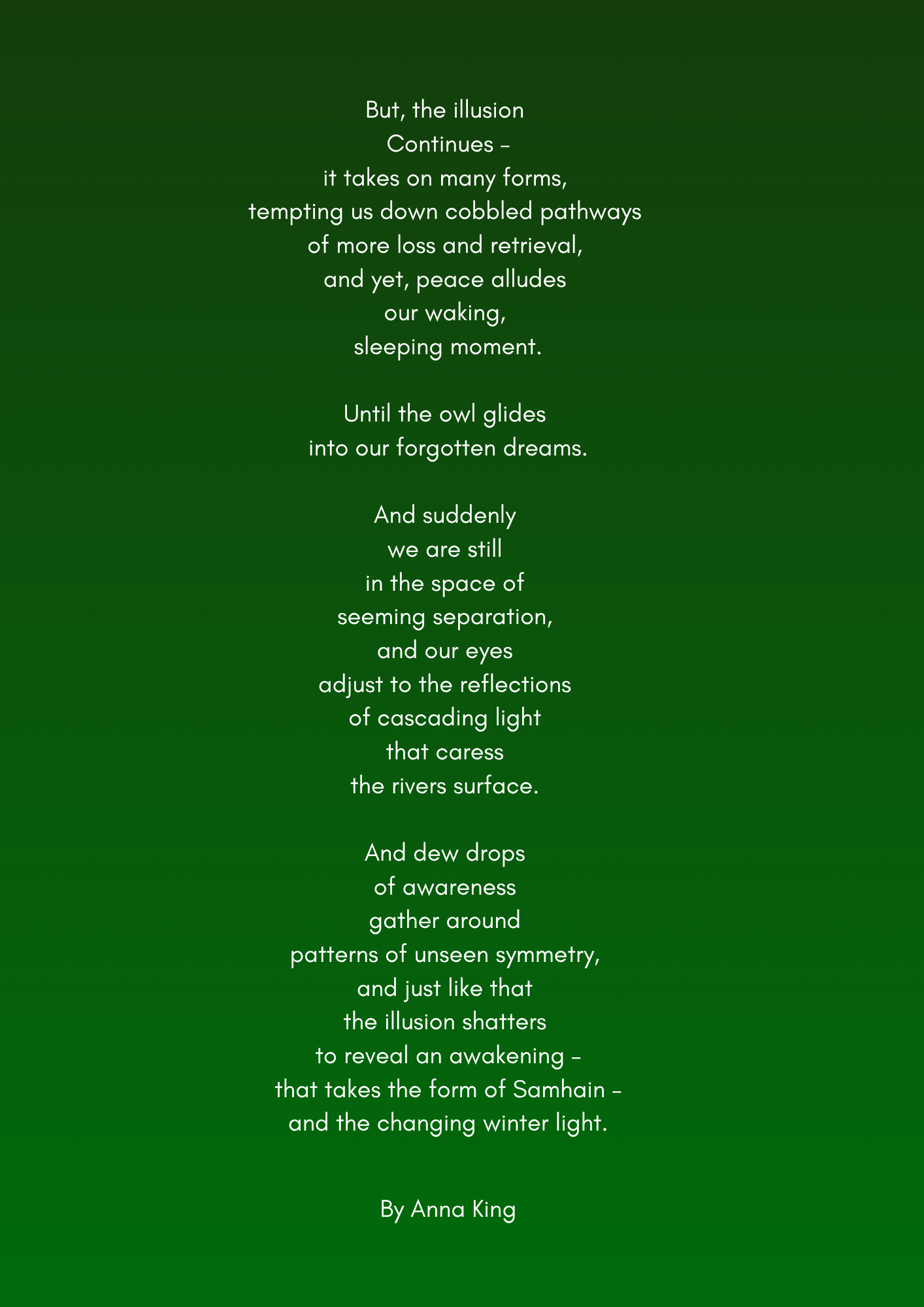 Written for Samhain, this poem reflects on the turning of the year and the shared rhythms of loss and renewal that move through the living world.