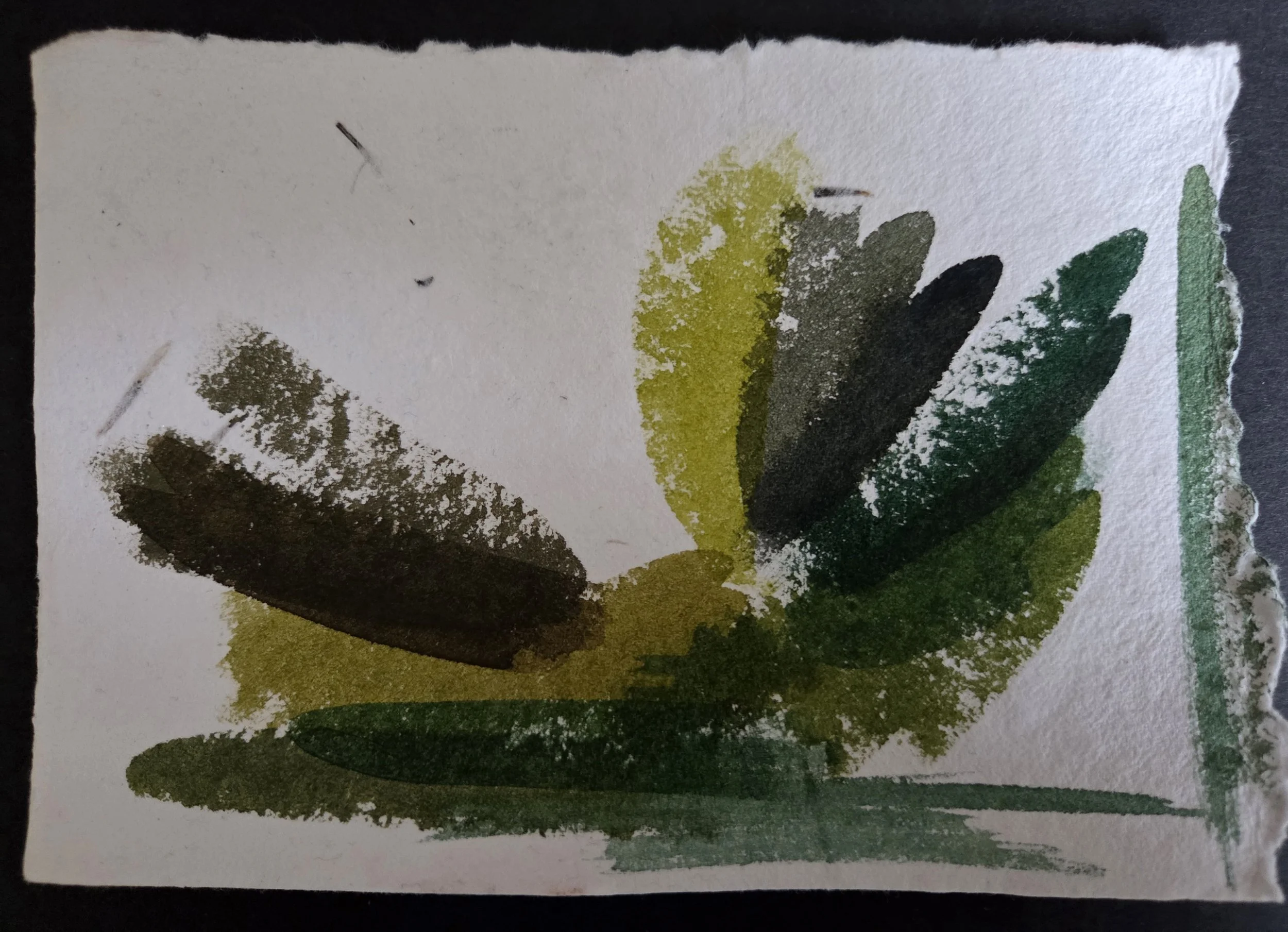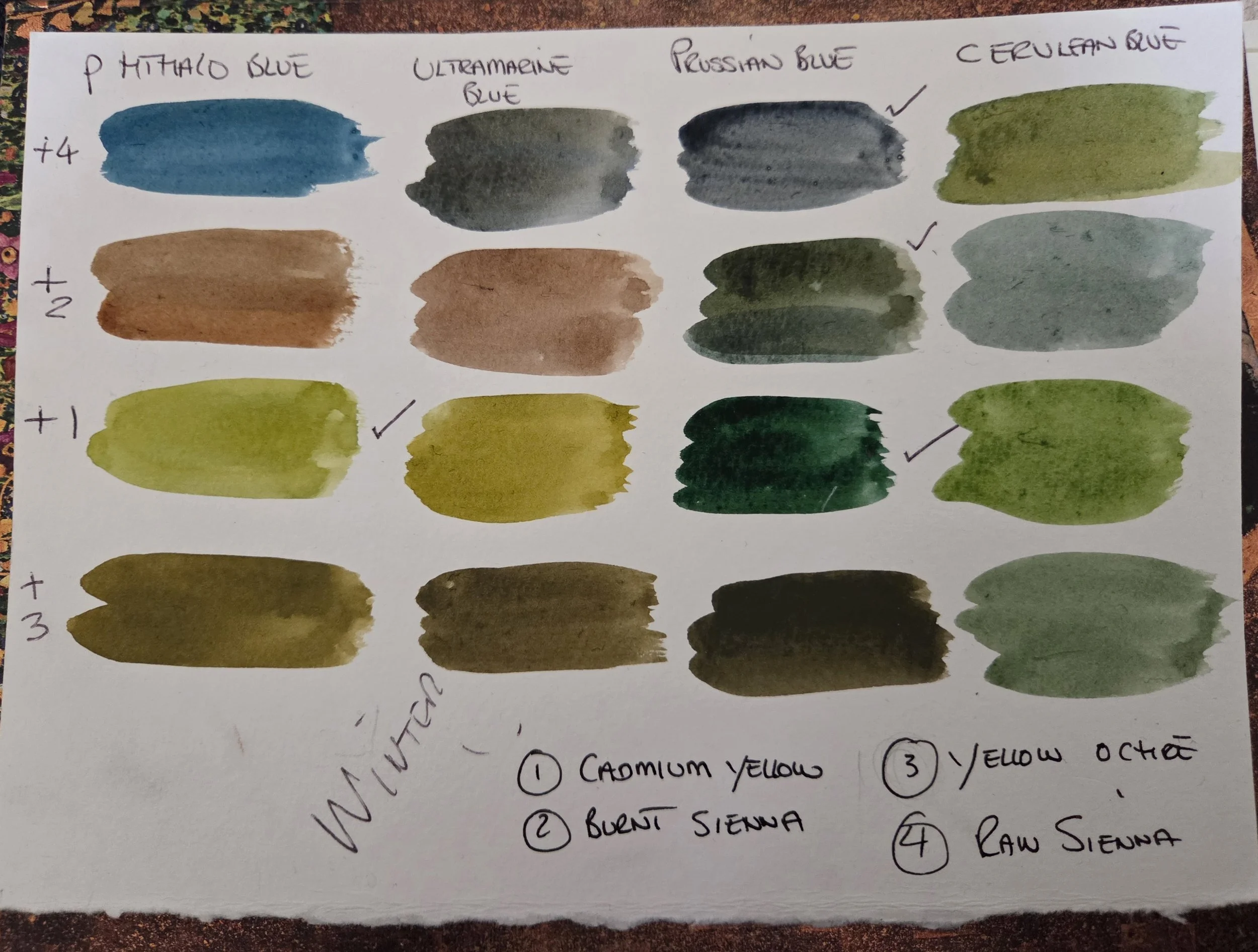 Testing blues and earth pigments to find the earthy winter greens of River Cong.